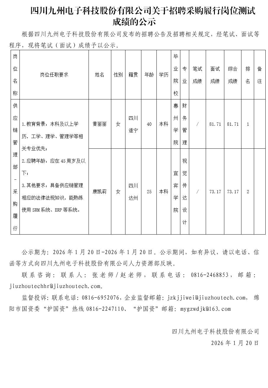四川九州电子科技股份有限公司关于招聘采购履行岗位测试成绩的公示