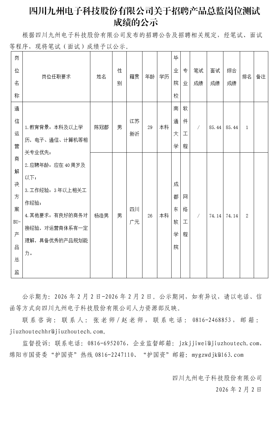 四川九州电子科技股份有限公司关于招聘产品总监岗位测试成绩的公示