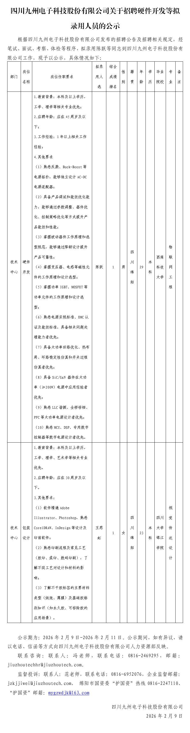 四川九州电子科技股份有限公司关于招聘硬件开发等拟录用人员的公示