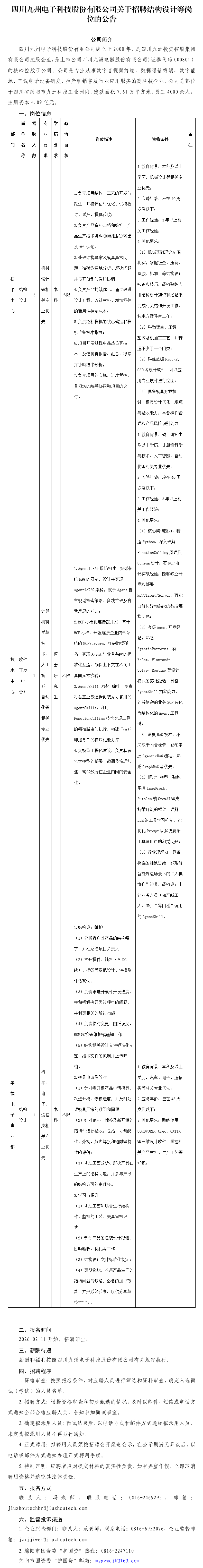 四川九州电子科技股份有限公司关于招聘结构设计等岗位的公告