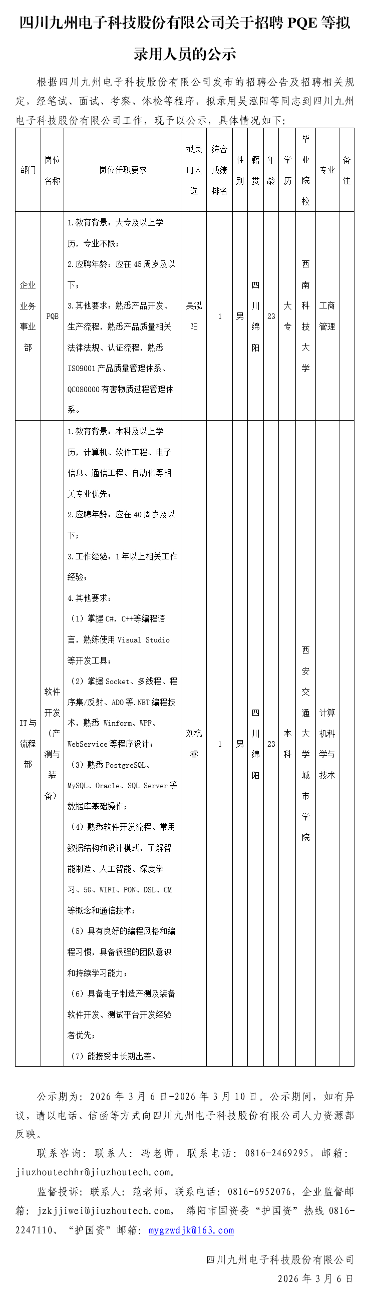 四川九州电子科技股份有限公司关于招聘PQE等拟录用人员的公示