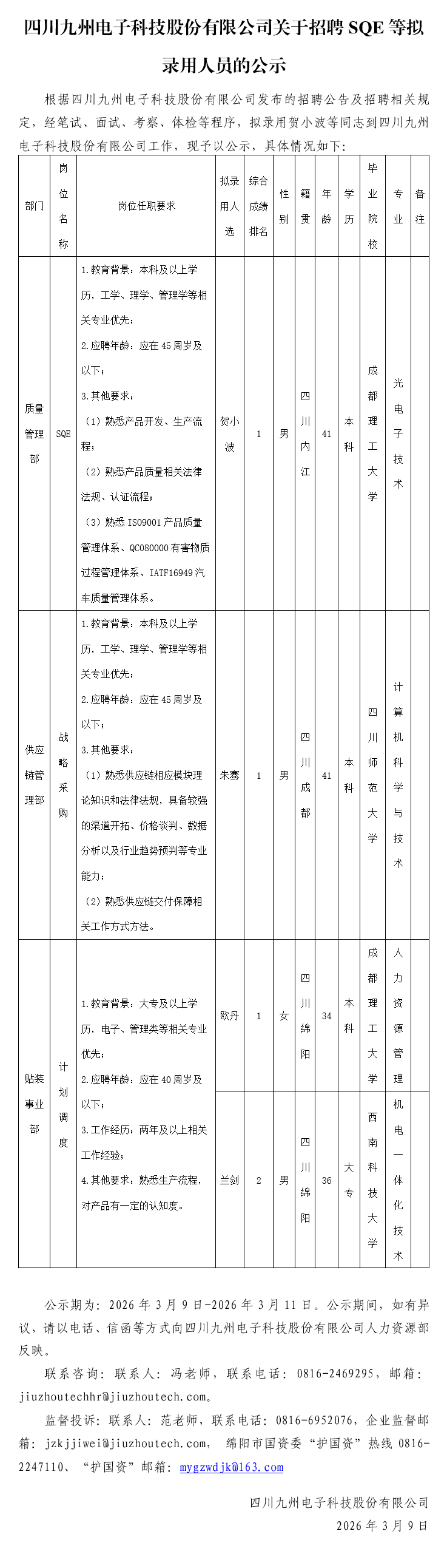 四川九州电子科技股份有限公司关于招聘SQE等拟录用人员的公示