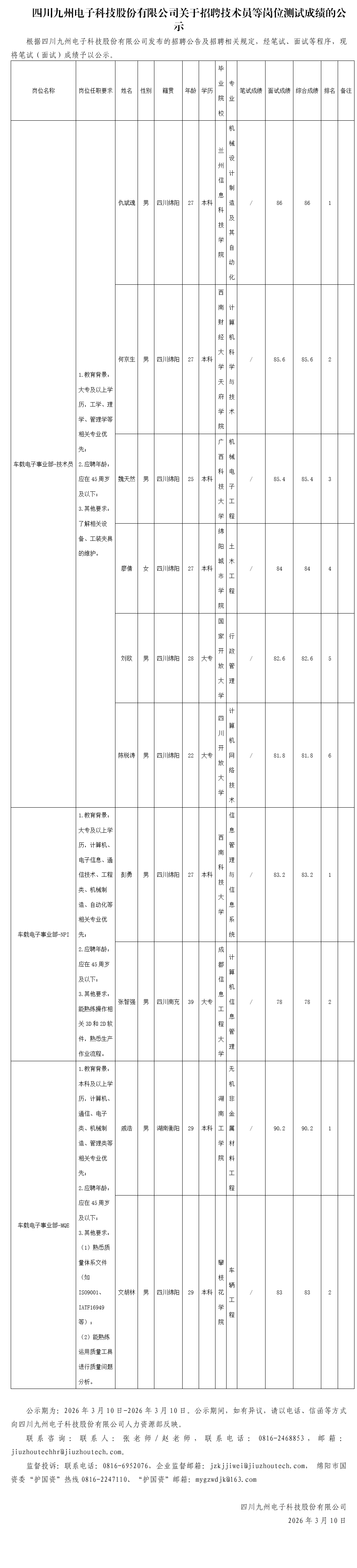 四川九州电子科技股份有限公司关于招聘技术员等岗位测试成绩的公示