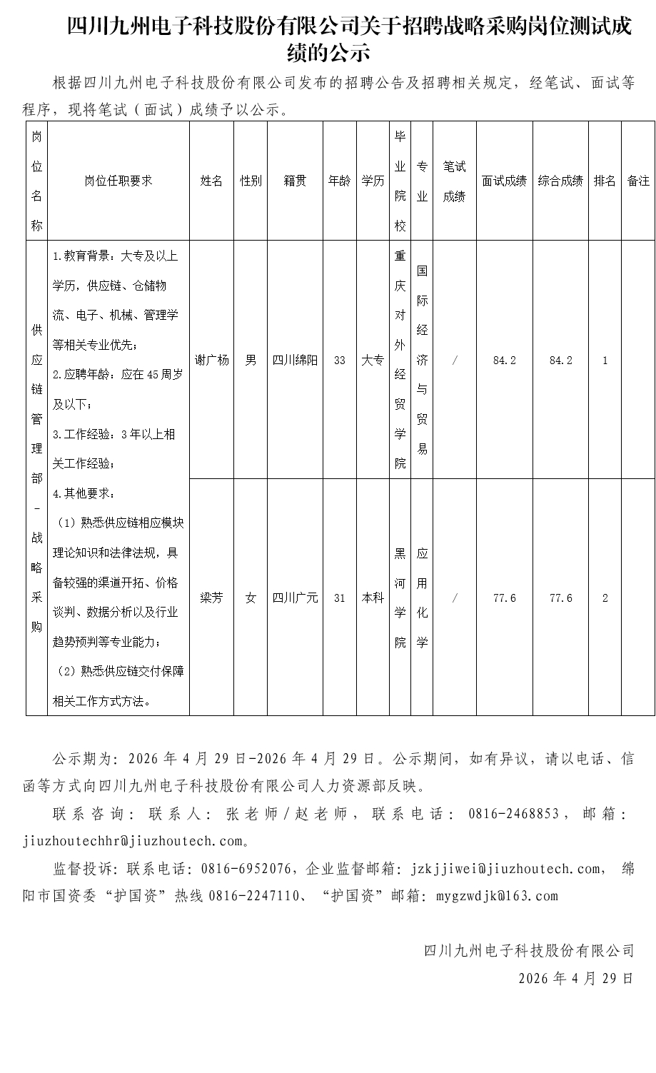 四川九州电子科技股份有限公司关于招聘战略采购岗位测试成绩的公示
