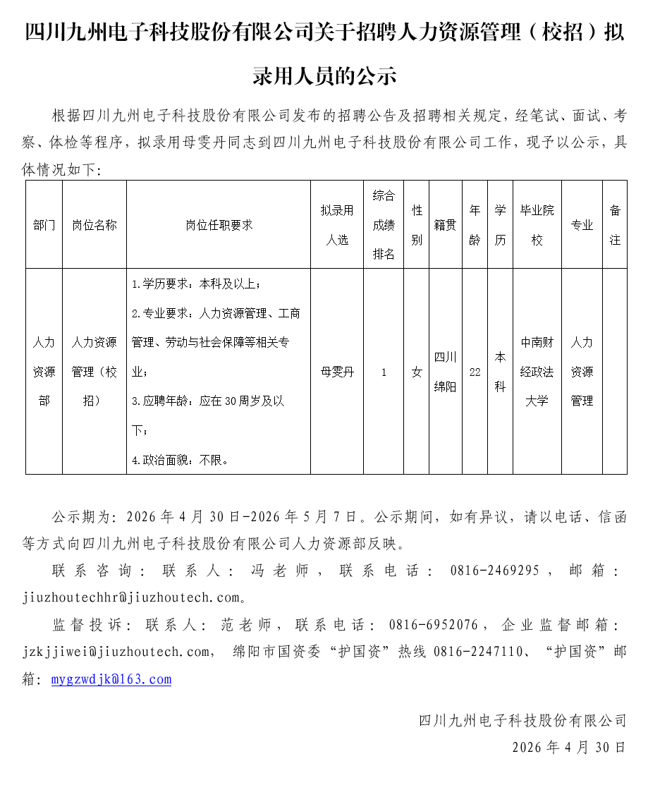 四川九州电子科技股份有限公司关于招聘人力资源管理(校招)拟录用人员的公示