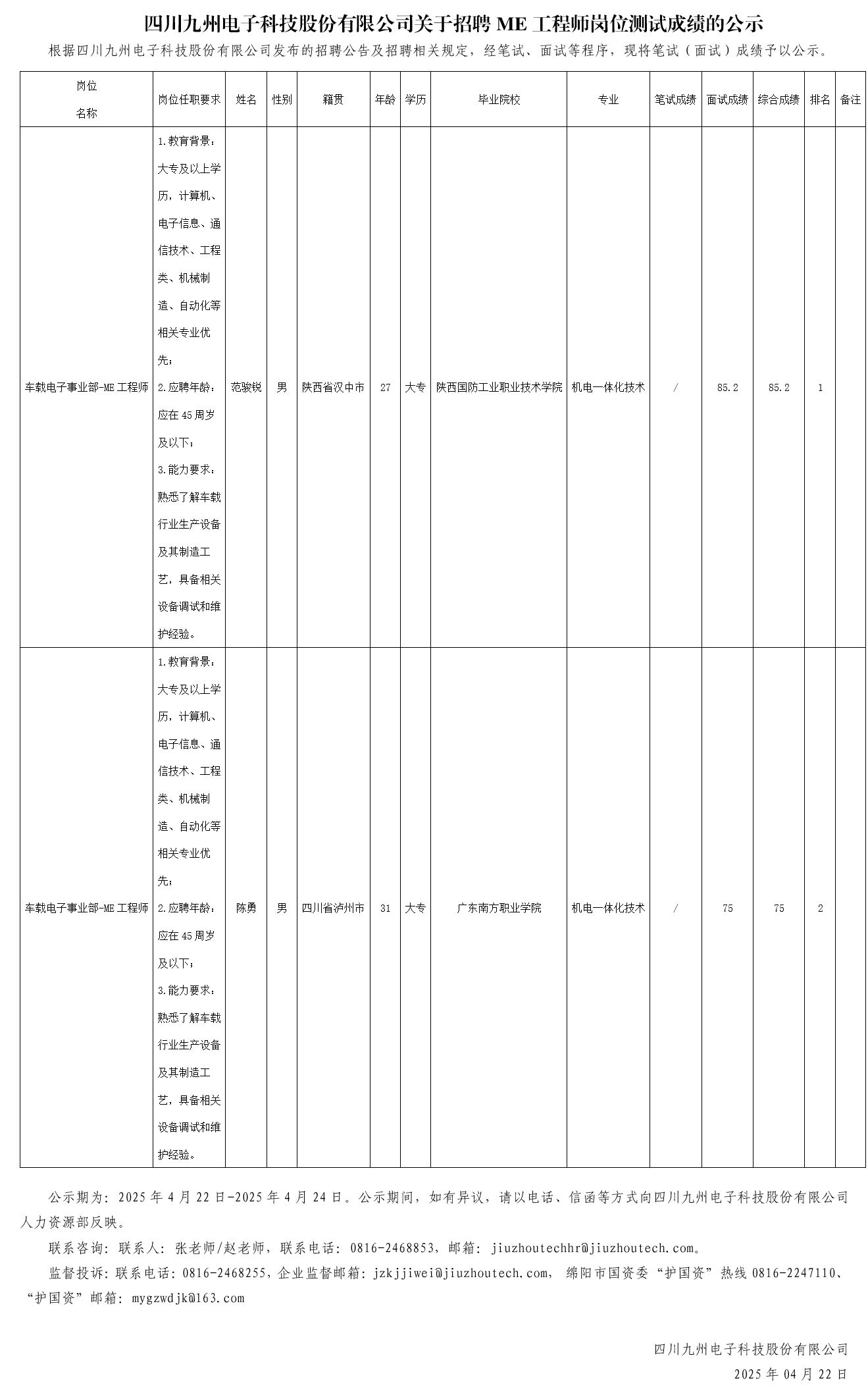 四川九州电子科技股份有限公司关于招聘ME工程师岗位测试成绩的公示