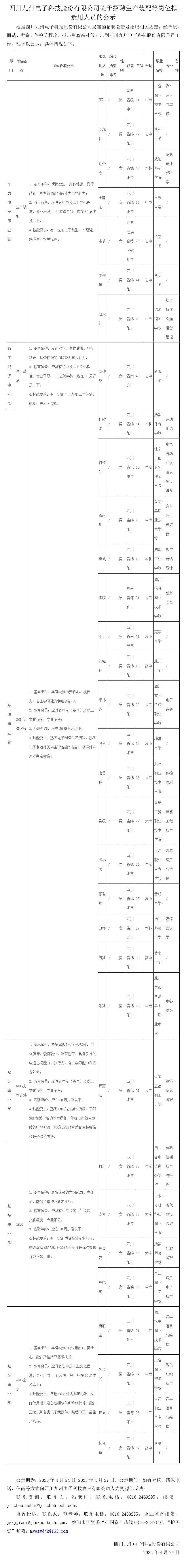 四川九州电子科技股份有限公司关于招聘生产装配等岗位拟录用人员的公示