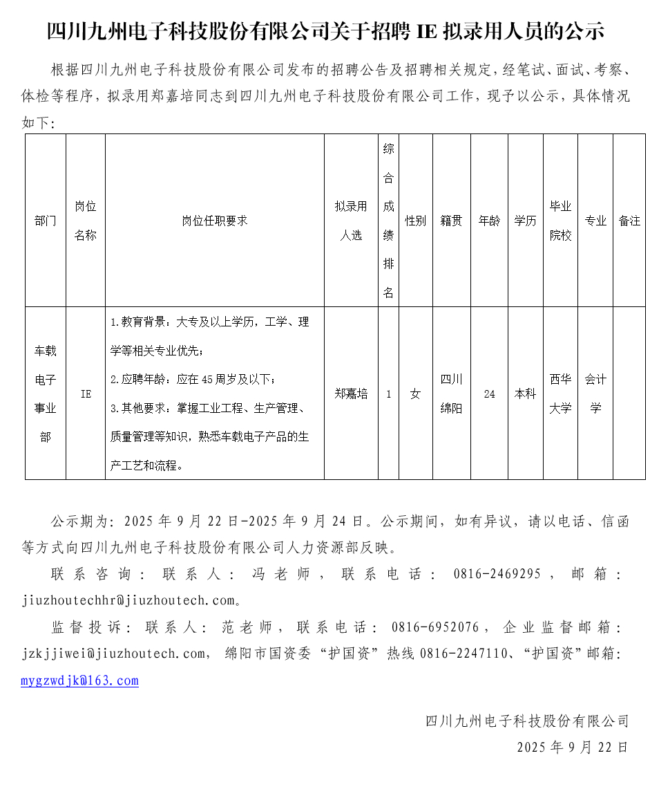 四川九州电子科技股份有限公司关于招聘IE拟录用人员的公示