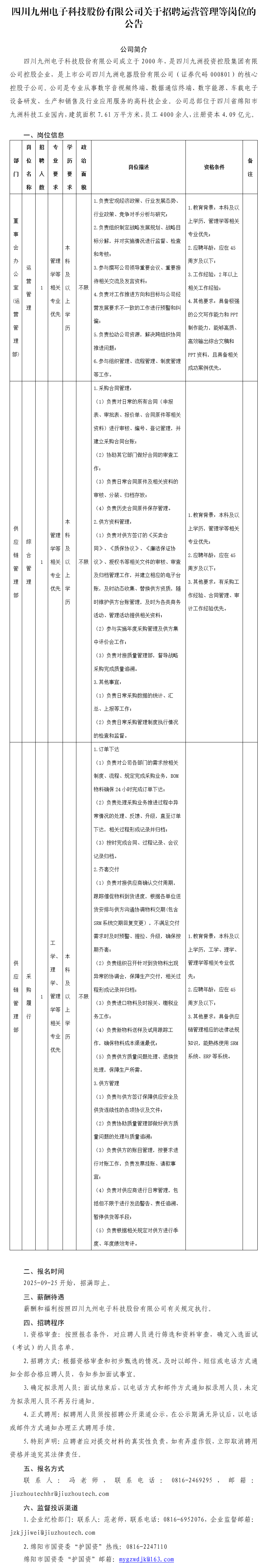 四川九州电子科技股份有限公司关于运营管理等岗位的公告