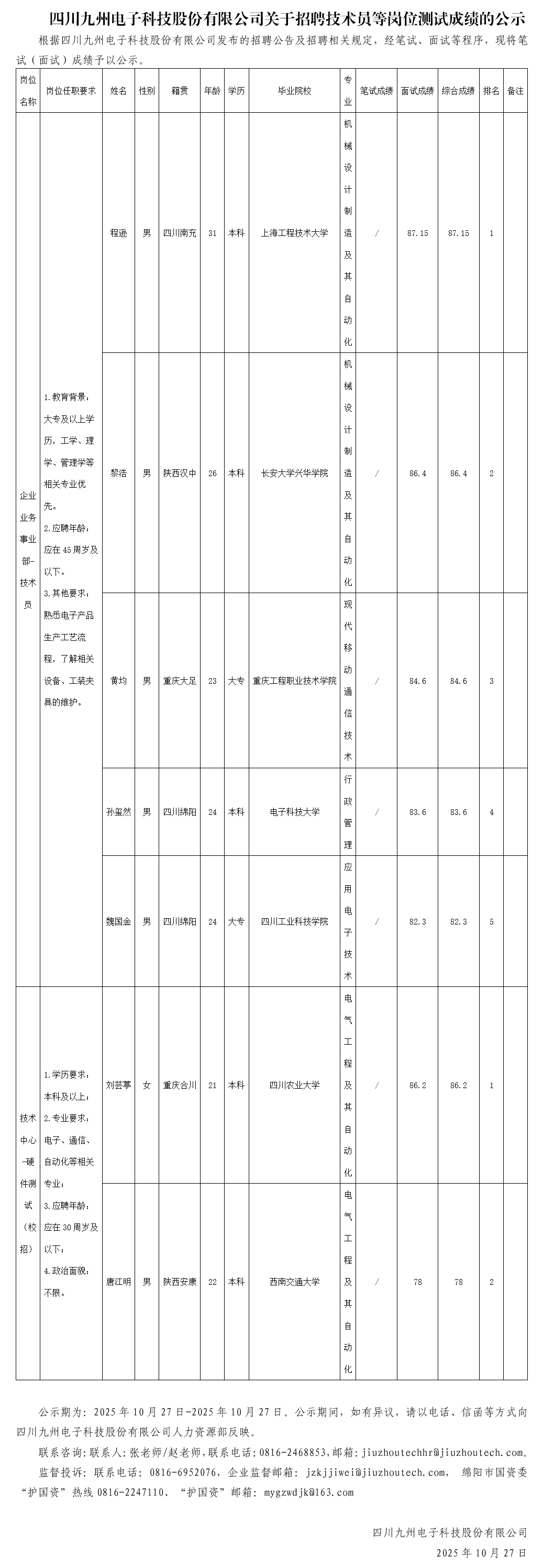 四川九州电子科技股份有限公司关于招聘技术员等岗位测试成绩的公示