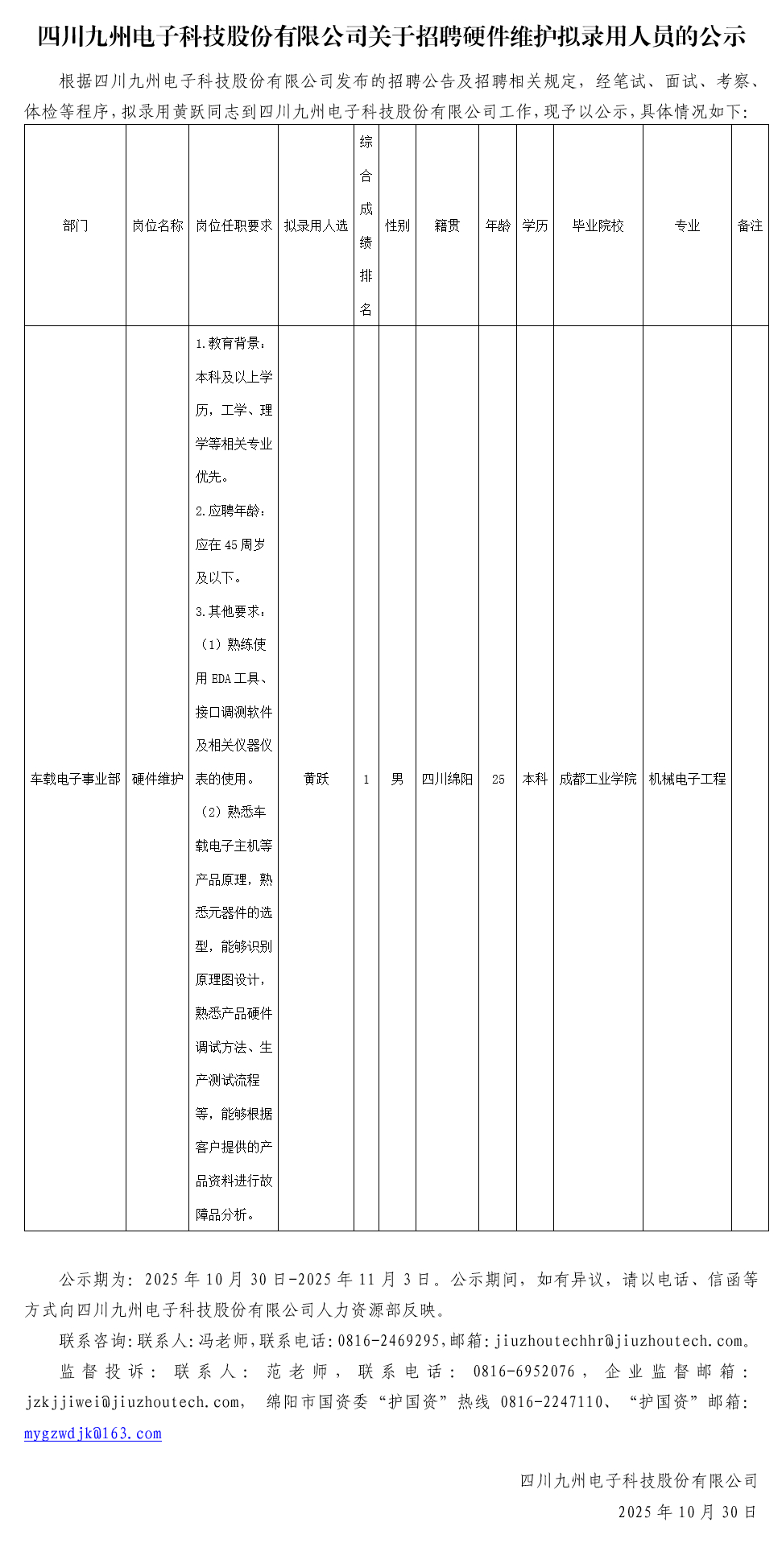 四川九州电子科技股份有限公司关于招聘硬件维护拟录用人员的公示