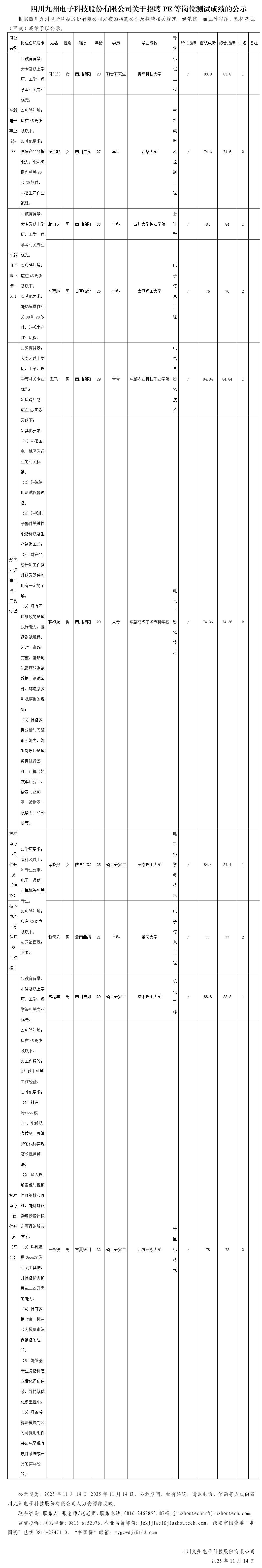 四川九州电子科技股份有限公司关于招聘PE等岗位测试成绩的公示
