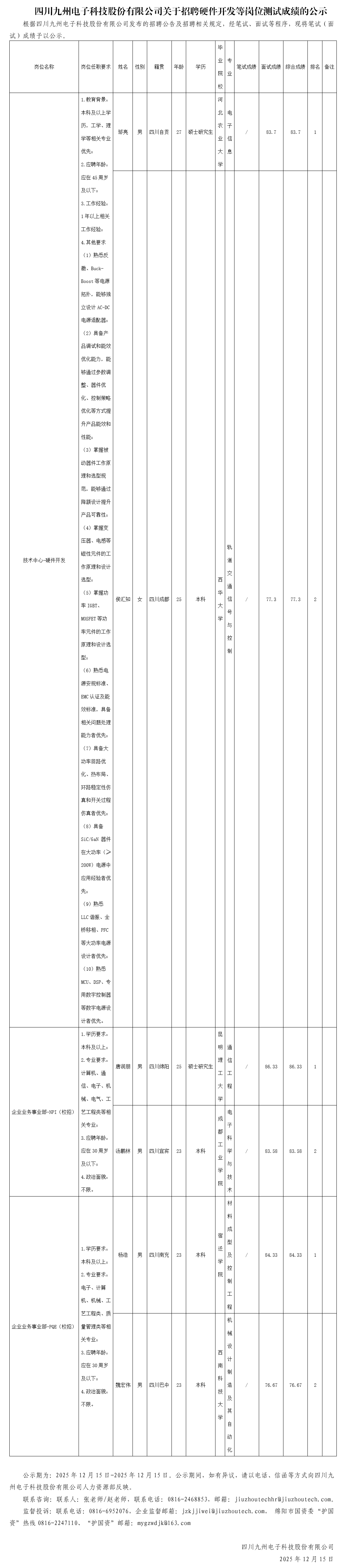 四川九州电子科技股份有限公司关于招聘硬件开发等岗位测试成绩的公示