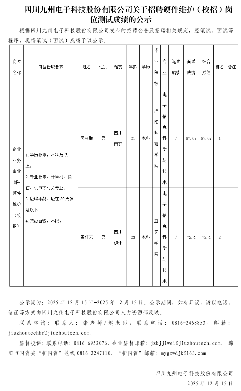 四川九州电子科技股份有限公司关于招聘硬件维护(校招)岗位测试成绩的公示