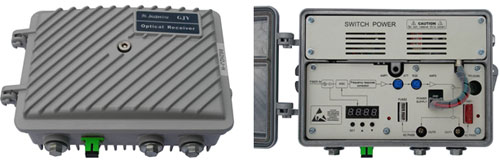 JIUZHOU Optical Node GJY862H2J-H or GJY862H2F-H is a highly reliable solution for FTTB application that doesn’t ask for return-path. The node employs a high quality Silicon Optical Receiver Module to complete O/E conversion. Then a GaAs MMIC amplifier chip and a GaAs power doubler amplifier module to enlarge RF signal. Interstage slope control is regulated by a 0~20dB variable equalizer while interstage gain control is regulated by a 0~20dB attenuator. Electronic gain control circuit is also built. Its tunable range is 0~15dB. Attenuation of electronic gain control could be set through operating buttons near to LED numeric display. The LED numeric display indicates actual optical input power and actual voltage of 5V power supply. Optical AGC technology is applied on this node. It keeps node’s output constant when optical input power varies from -7dBm to +1dBm.