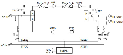 RF signal slope is regulated by plug-in fixed value equalizer, and RF level can be tuned by plug-in fixed value attenuator. Equalizer and attenuator are of the same small plug-in unit.