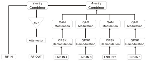 The device accepts up to four DVB-S/S2 satellite inputs, and completes QPSK demodulation + QAM modulation. Accordingly, CM3014 uses maximum 4 QAM TPs. A 4-way combiner embedded in CM3014 mixes RF signals from QAM TPs as one. The Mixed RF has a tuning range of 0~5dB in level. However, each QAM TP’s RF level could be adjusted independently too.