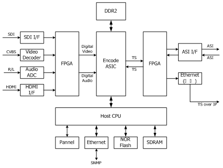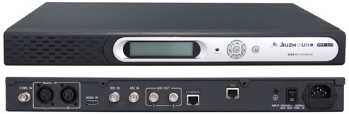 JIUZHOU H.264 Encoder DVE-5 can accept inputs like analog A/V, HDMI, SDI (embedded with digital audio). It completes encoding/compression as per H.264 and generates ASI stream up to DVB standards. It can transform MPEG-2 into H.264 too.